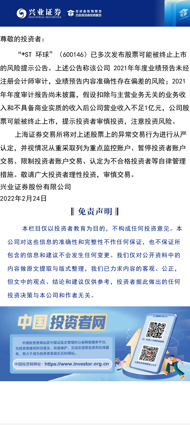 【兴·公告】关于“*ST 环球”(600146)股票交易的风险提示