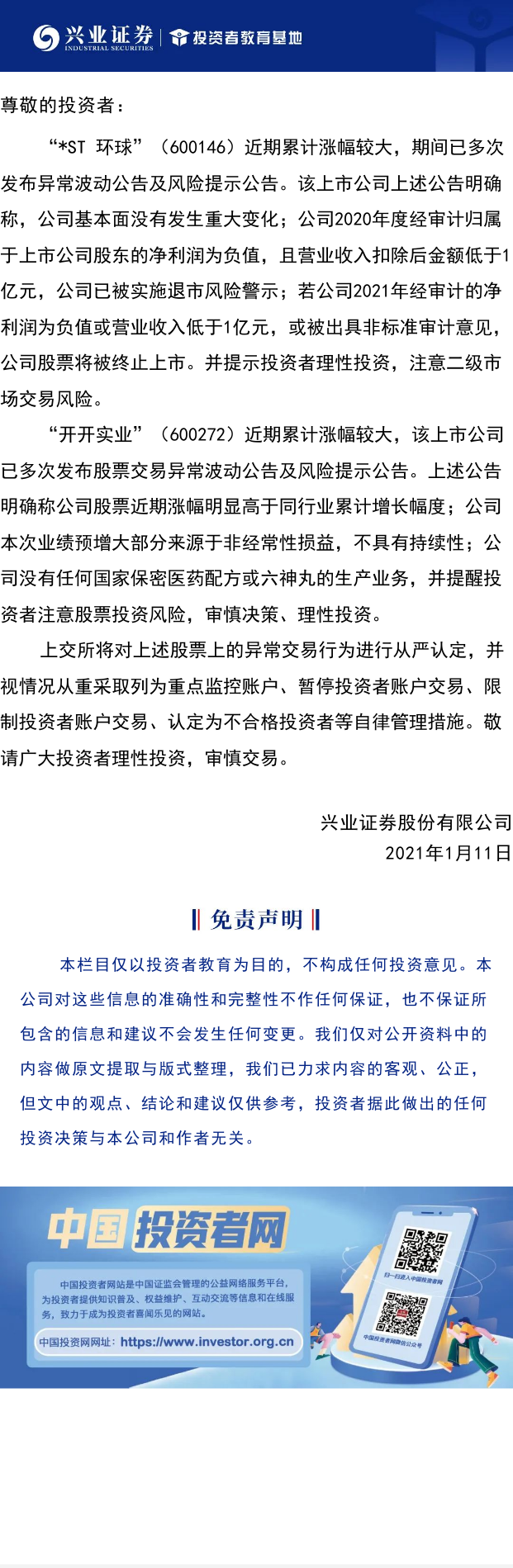 【兴·公告】关于做好“开开实业”(600272)、“*ST 环球”(600146) 股票交易的风险提示