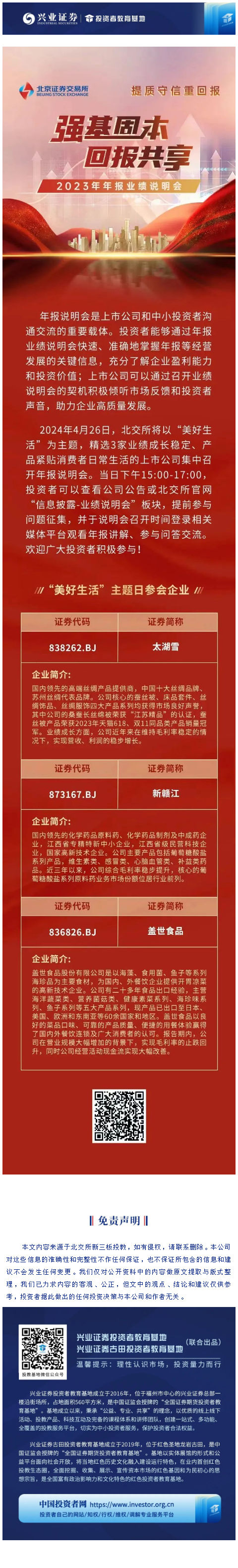 【兴·分享】“提质守信重回报”——北交所上市公司2023年年报业绩说明会“美好生活”主题日预览