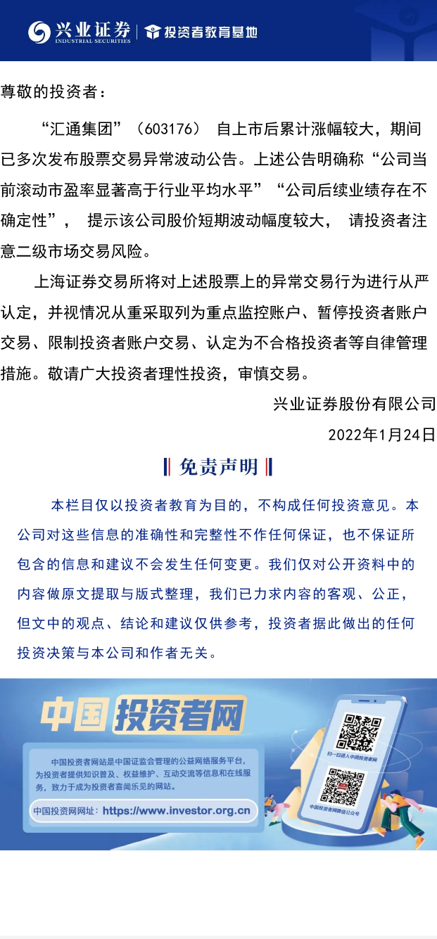 【兴·公告】关于“汇通集团”(603176)股票交易的风险提示
