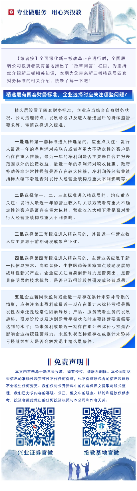 【投教·新三板】改革问答 | 第四十三期:精选层有四套财务标准,企业选择时应关注哪些问题?