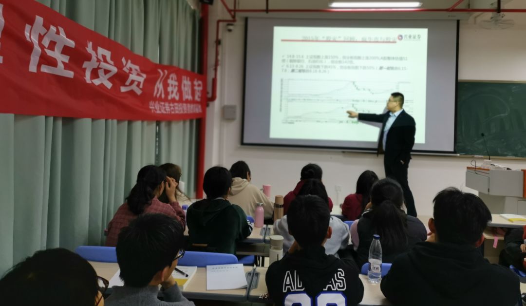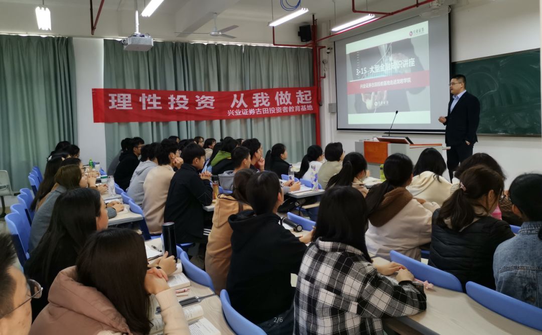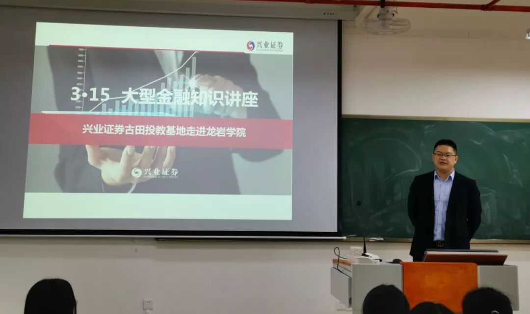 为不断探索“将投资者教育纳入国民教育体系”的新路径,提升高校学生金融知识水平,正确认识中国证券市场,树立理性投资、价值投资理念,2019年3月15日,兴业证券古田投资者教育基地走进龙岩学院经济管理学院投资学专业开展《中国资本市场概述》和《大众理财及价值投资》大型金融知识讲座,由龙岩分公司侯彬远老师作为主讲嘉宾,为到场近百名金融学子分享资本市场跌宕起伏的历史与故事。