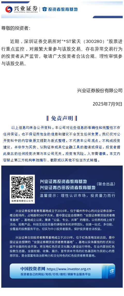 【兴·公告】关于深交所“*ST紫天(300280)”重点监控证券交易的风险提示