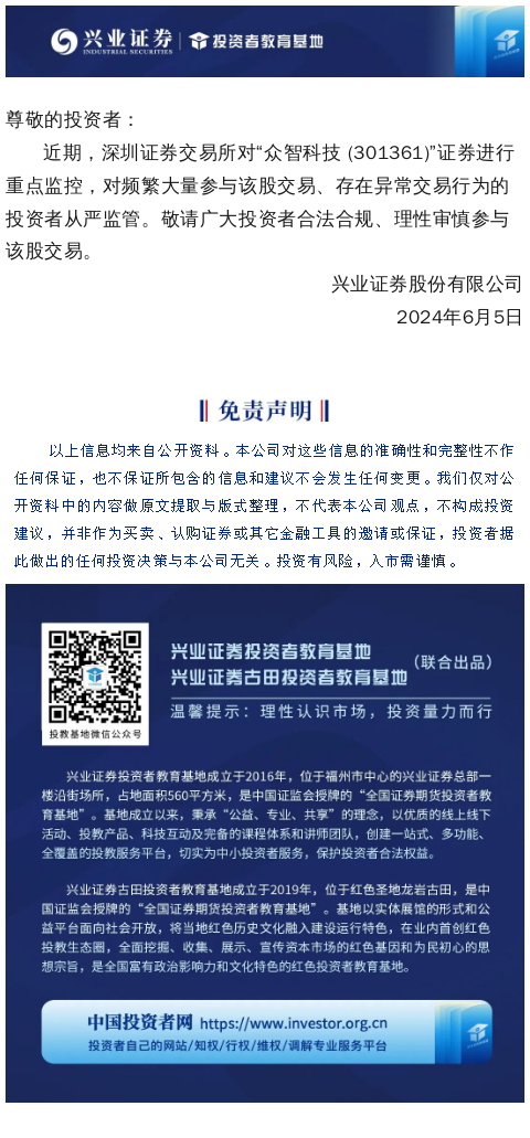 【兴·公告】关于深交所“众智科技 (301361)”重点监控证券交易的风险提示